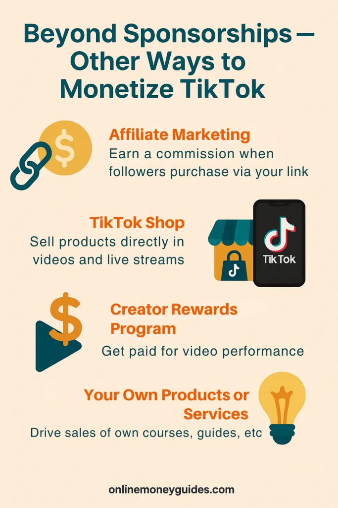 Sponsorships are powerful, but combining them with affiliate income, TikTok Shop, or your own offers gives you more control over your earnings.