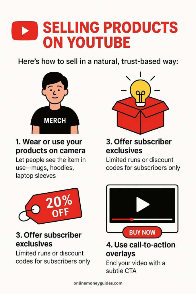 | YouTube Shopping / Merch Shelf | Sell physical products or affiliate products linked under videos |
