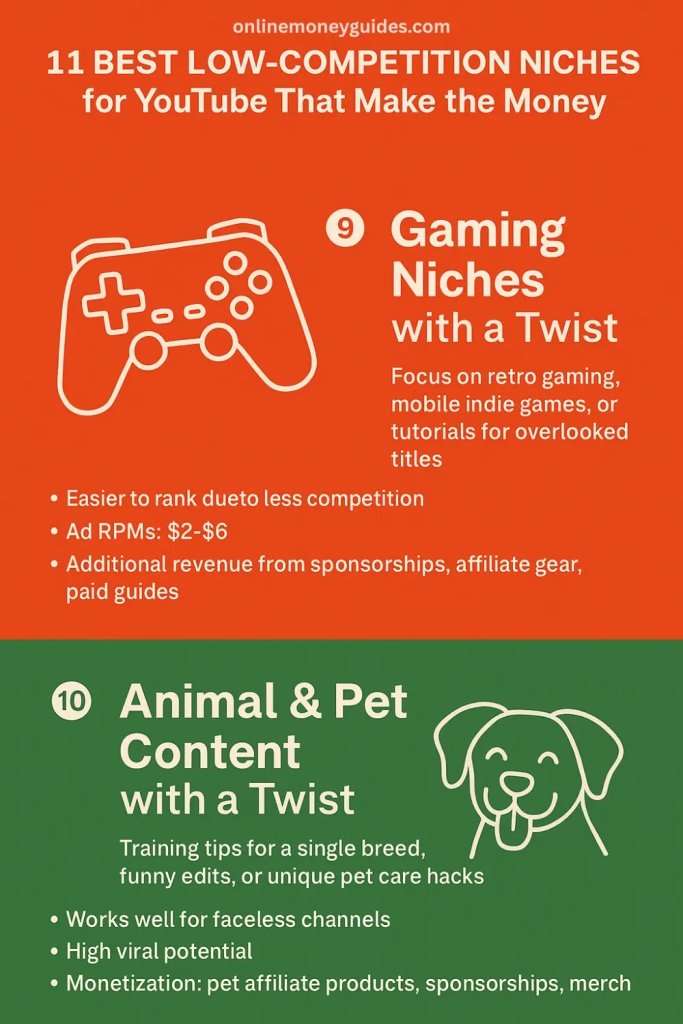 These videos are easier to rank because fewer creators are covering them. Gaming tends to have lower ad RPMs ($2–$6), but sponsorships, affiliate gear, or even your own paid guides can add to revenue streams.